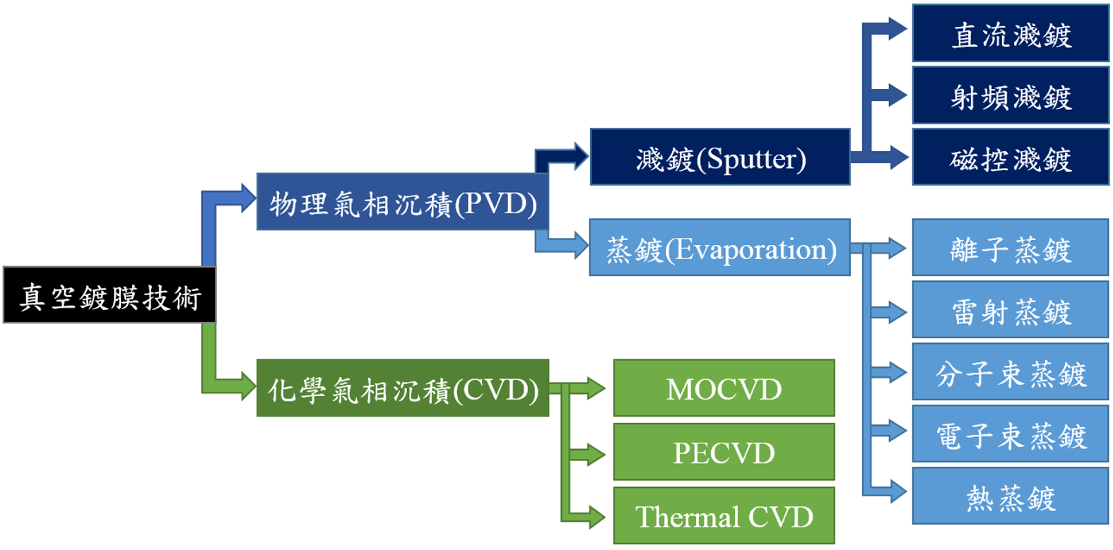 Common coating techniques are shown in the figure, ranging from traditional electroplating to today's vapor phase methods, such as physical vapor deposition(PVD) and chemical vapor deposition(CVD). As the industry progresses, the requirements for the quality of the film are also raised. Compared with the traditional electroplating method, the vacuum environment can ensure that no other substances are added to the film during the process. In today's high-tech industry and the high-quality requirements of the semiconductor industry, vacuum coating technology is the most suitable coating technology, and it is also a key technology for high-tech industries.